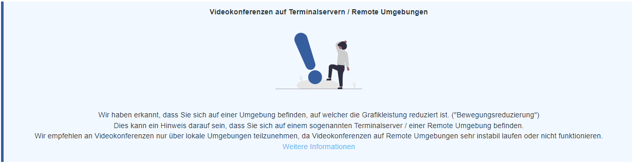 Wir empfehlen an Videokonferenzen nur über lokale Umgebungen teilzunehmen, da Videokonferenzen über Terminalserver / auf Remote Umgebungen sehr instabil laufen oder nicht funktionieren.